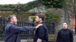 Londonderry’s “Walled City Passion,” a live, outdoor dramatization of the Passion Play set in modern times, takes some liberties with the Gospel stories. Last year, for example, Pontius Pilate’s wife, Claudia, and Jesus’ friend Mary Magdalene took the spotlight. This year’s lead character was Dave, one of four guards charged with delivering Jesus to his death. Dave wears a navy blue protective vest printed with “IST” (short for Internal Security Team) in white block letters, a black long-sleeved shirt and pants, and combat boots. He’s just doing his job as he joins his fellow officers in arresting a rabble-rouser. Then, he develops a conscience.